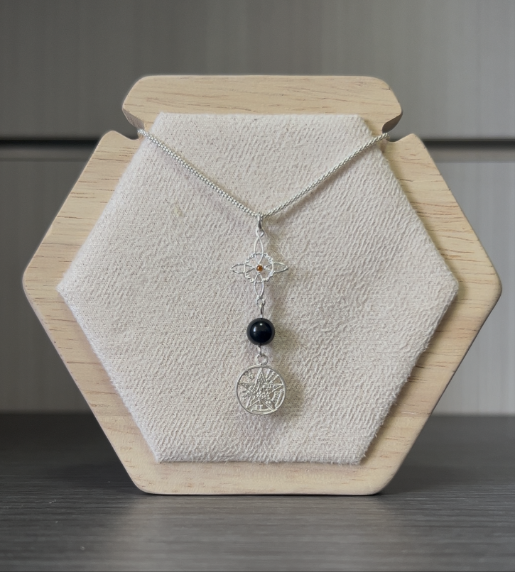 Colgante doble protección con turmalina en plata de ley consagrado y activado, el nudito tiene una circonita de color en el centro.